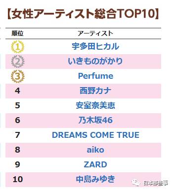 我们的歌姬大人终于再次发力了!去年排名第五,今年第二,恭喜宇多田光!而且在单独女歌手TOP 10部分荣登冠军。以世代区分的排行榜中,宇多田也成功俘获了20代、30代、40代族群的心。