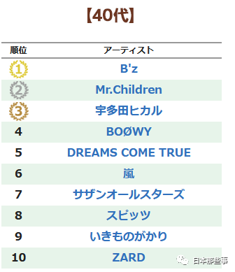 B'z的发挥一直很稳定。去年和今年都是第四。而且从2015年开始,连着三年B'z一直都是在40代部分的选择中,位于榜首。