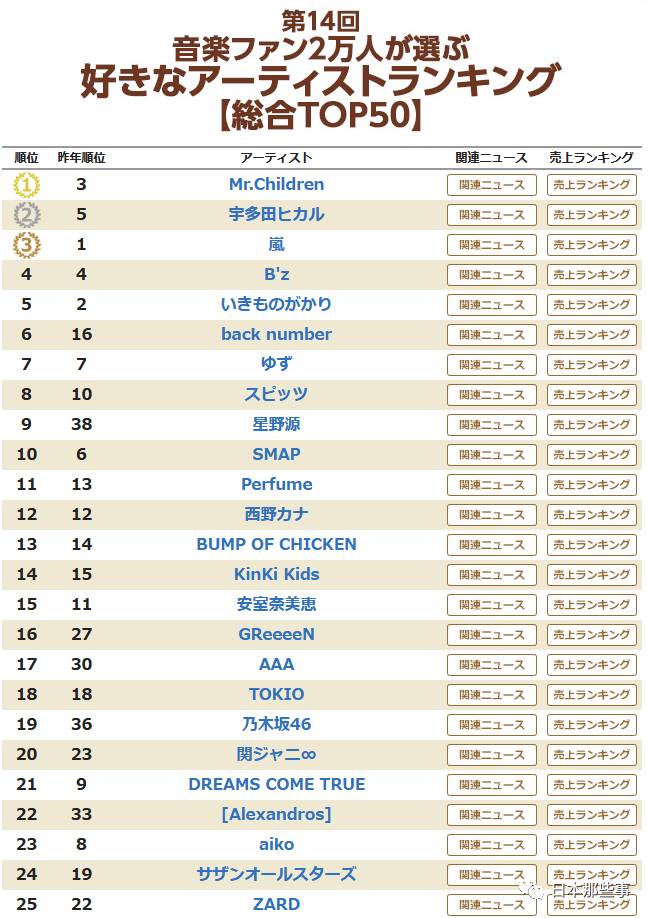 Spitz去年第十,今年第八,上升两位,恭喜恭喜!po个人觉得Spitz真的是一个神奇又可爱的乐队。作为九零年代日本代表性乐队,他们带来了太多名曲。没有华丽的包装,单纯凭借质朴的音乐,在日本乐坛活跃了30年,拥有多张百万张片,至今仍然拥有横跨各个年龄层的粉丝群。