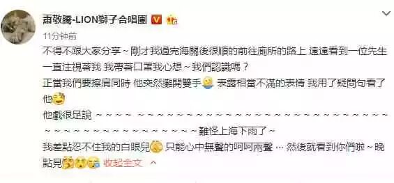 萧敬腾微博全文:不得不跟大家分享~刚才我过完海关后很順的前往厕所的路上, 远远看到一位先生 一直注视着我 ,我带着口罩我心想~我们认识吗?正当我们要擦肩同时, 他突然摊开双手, 表露相当不满的表情, 我用了疑问句看了他,他戏很足说 :难怪上海下雨了~我差点忍不住我的白眼儿,只能心中无声的呵呵两声 ⋯ 然后就看到你们啦~晚点见!