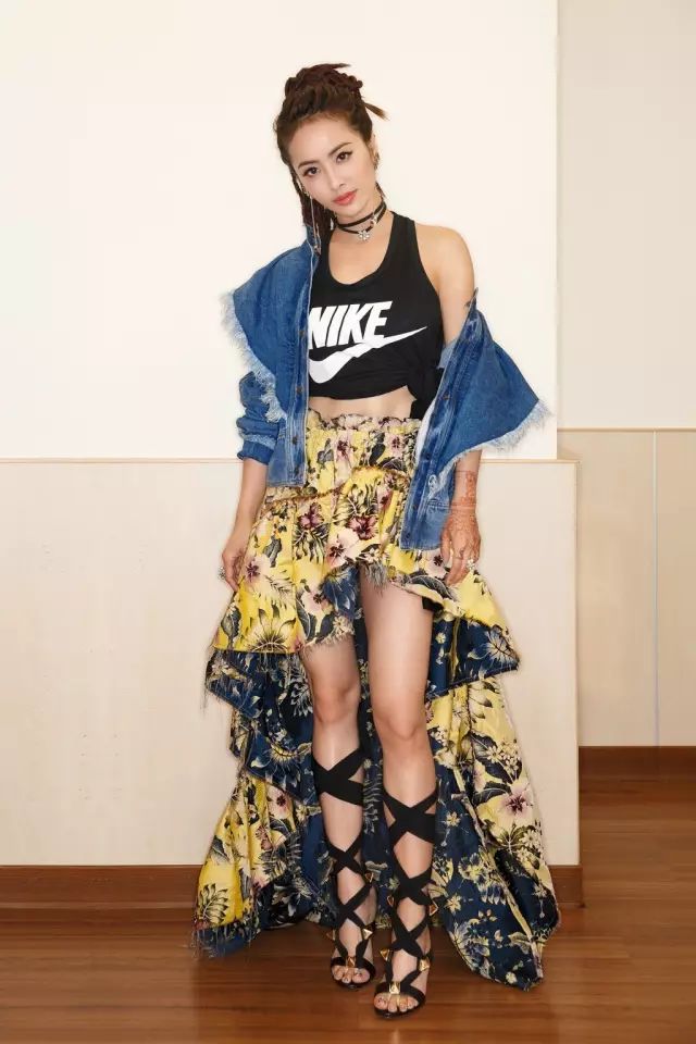 Jolin这套LOOK依旧是走华丽复杂的风格,前长后短的印花裙已经打下了拉伸腿长的基础,背心又被巧妙的打上了结制造短上衣的效果,微微露出腹部的肌肤,小个子们都GET到了吗?▼