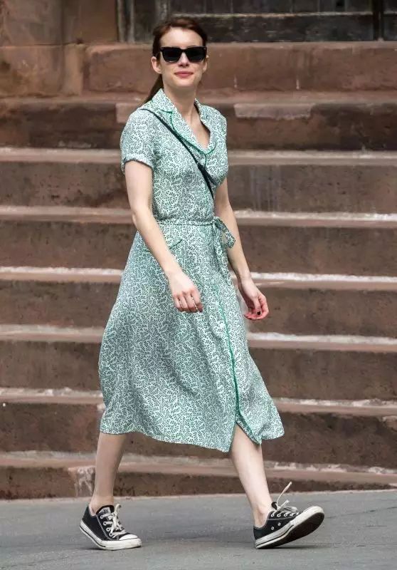 学生感十足的绿色碎花衬衫长裙搭配帆布鞋,Emma的青春力可不是盖的!▼
