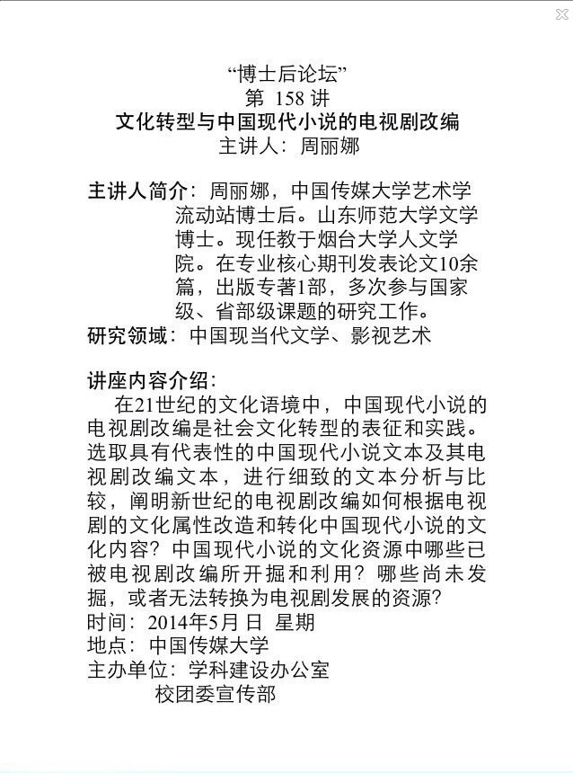 【备注】主讲人:周丽娜(传媒大学流动站博士后、 山东师范大学文学博士)