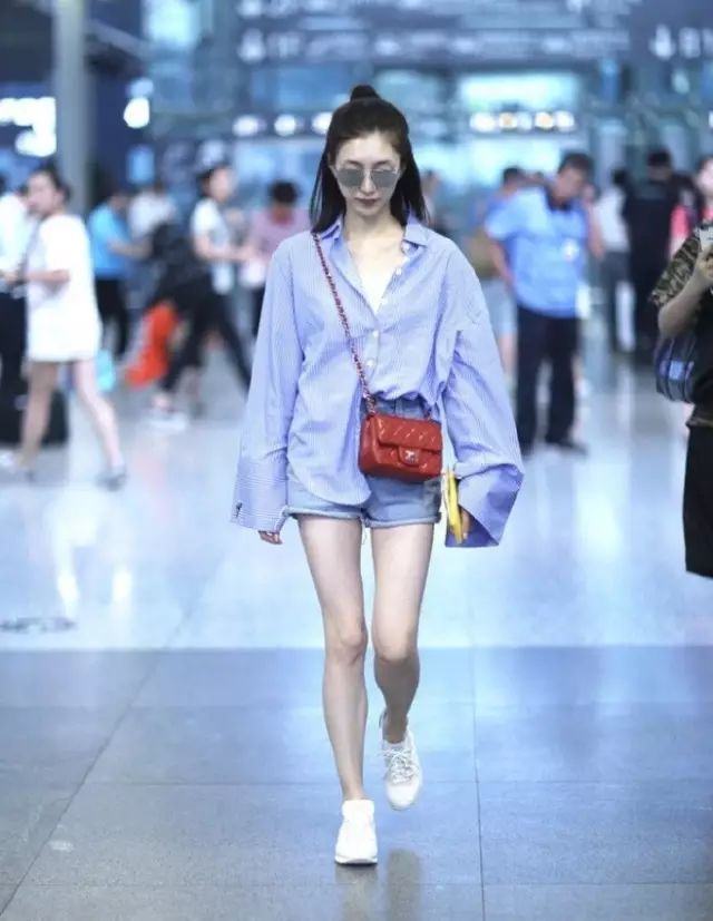 江疏影的长袖衬衫搭配高腰牛仔短裤