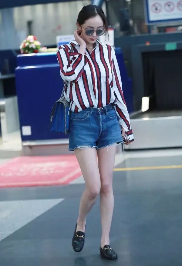 大幂幂的各种条纹衬衫or卫衣搭配短裤短裙的look