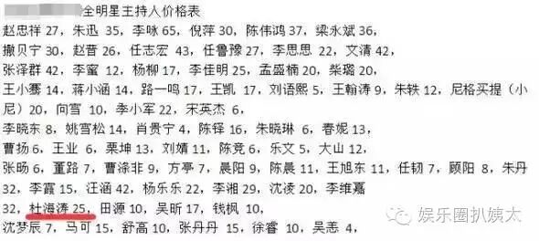 但是杜海涛的商演价却非常高,一份网上流出的2014年的主持人商演报价单,杜海涛为每场地25万起价,远超吴昕,田源,钱枫等人。