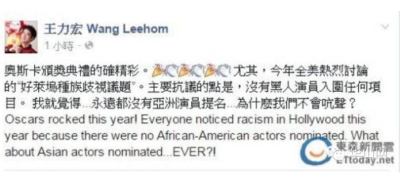 第88届奥斯卡金像奖在台湾时间29日落幕,由于本次95%以上的入围者都是白人,引发外界质疑种族歧视,多位黑人演员更公开抗议,以不出席的方式抵制典礼,掀起热议。艺人王力宏也发表对种族议题的看法,指出奥斯卡名单内同样不见亚洲演员,但为何就没有人为此抗议?