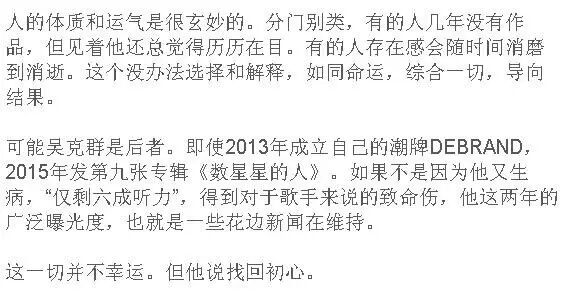 一个音乐人,丧失了部分听力。那当然是个遗憾。但也给了他成为贝多芬的机会。中国人最好拥有“塞翁失马”的乐观。就像他在新歌里写“它不尽人意不够美丽”,但必须要说“我无所谓”。