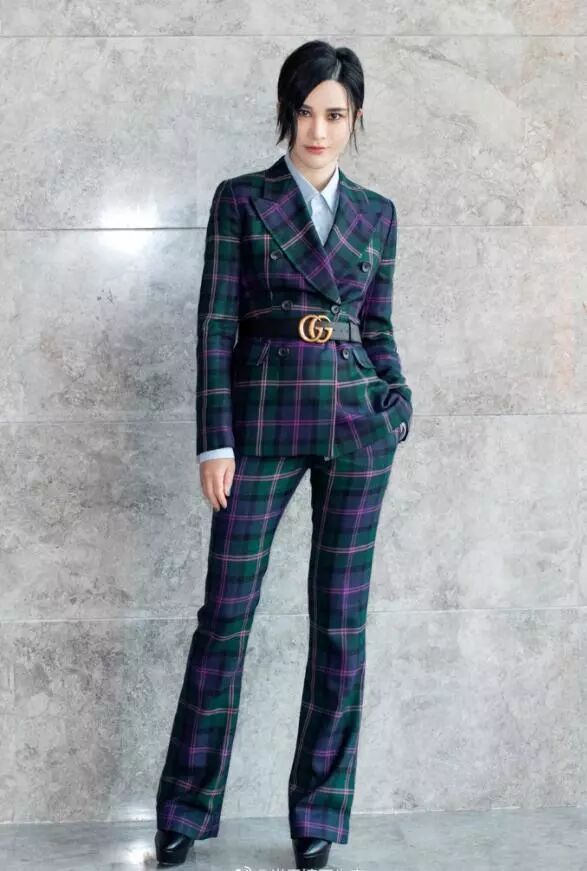 一身绿色和紫色相互勾勒的格子西服很炫酷大方,搭配黑色的高跟鞋充满魅力,将复古的服装穿出一种高级感。不过女神对古驰的腰带是真爱呀。