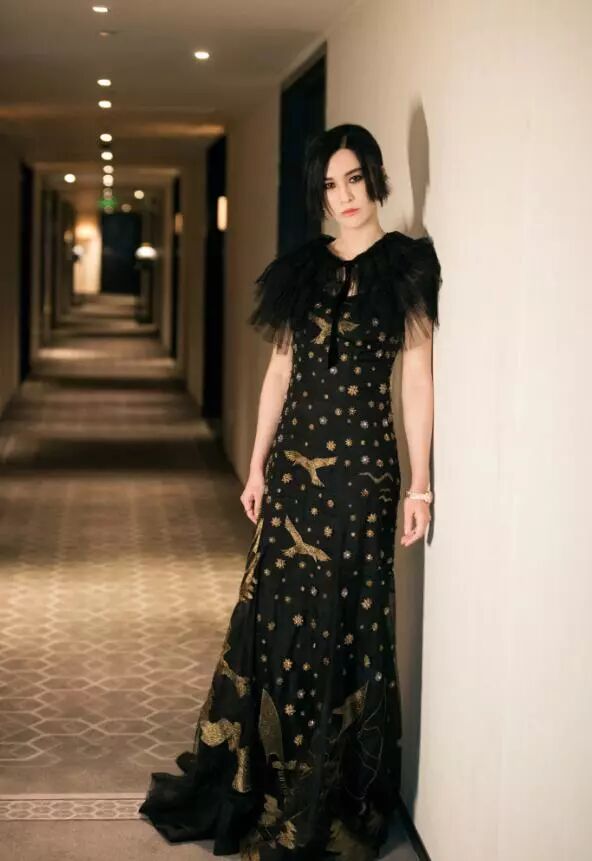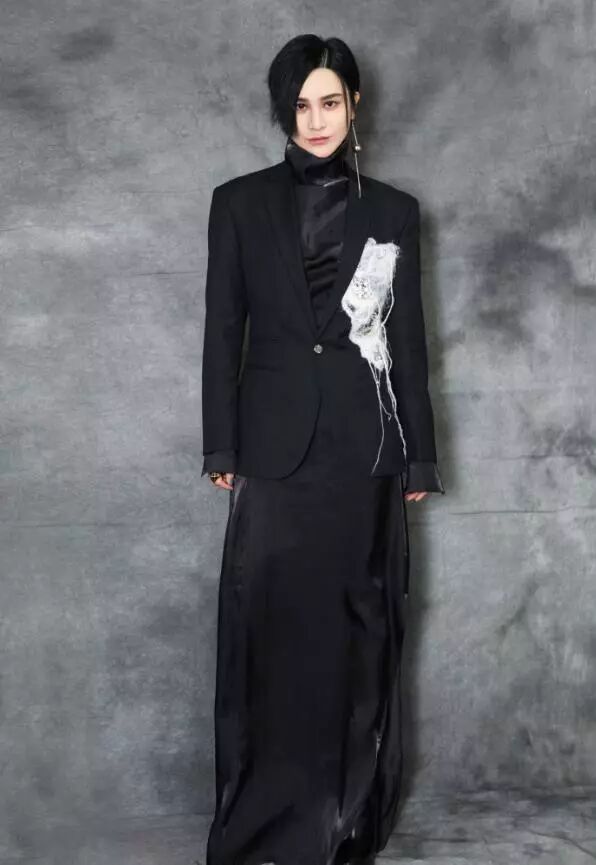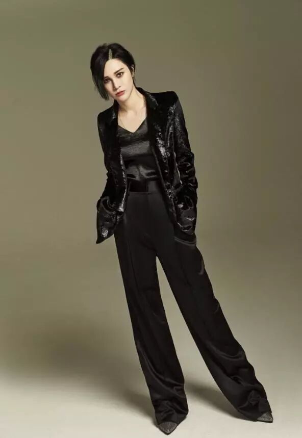 一身黑色的穿搭个性十足,简直不要太帅呀,黑色的连衣长裙没有任何的修饰很大气,搭配黑色的西装加上别致的图案很有范儿。