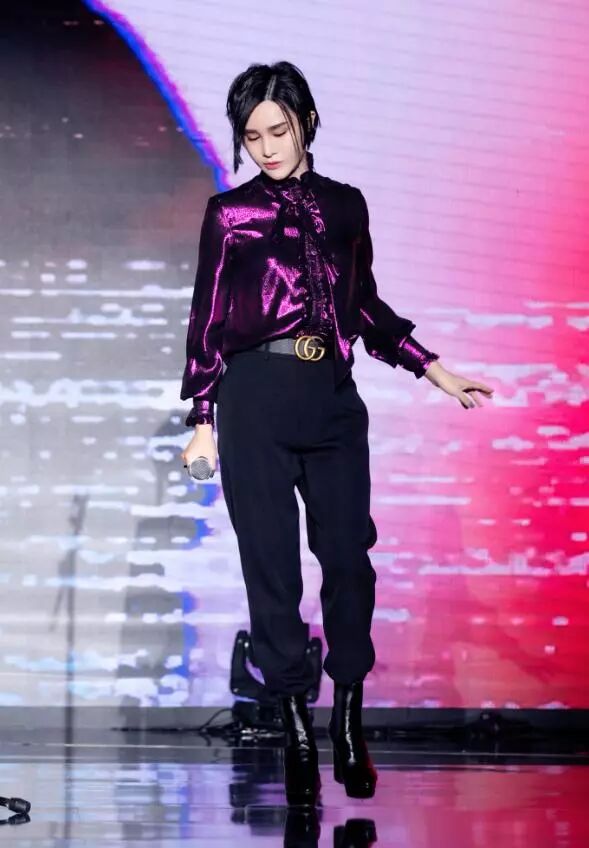 舞台上她就是女王呀,紫色的衬衫炫酷儒雅,有几分神秘的感觉,搭配黑色的长裤个性加分,古驰的腰带充满质感。