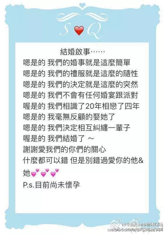 寰亚传媒集团媒体总监也晒出两人的婚照,附文称“恭喜冯德伦娶舒淇!拥抱幸福快乐喔!”