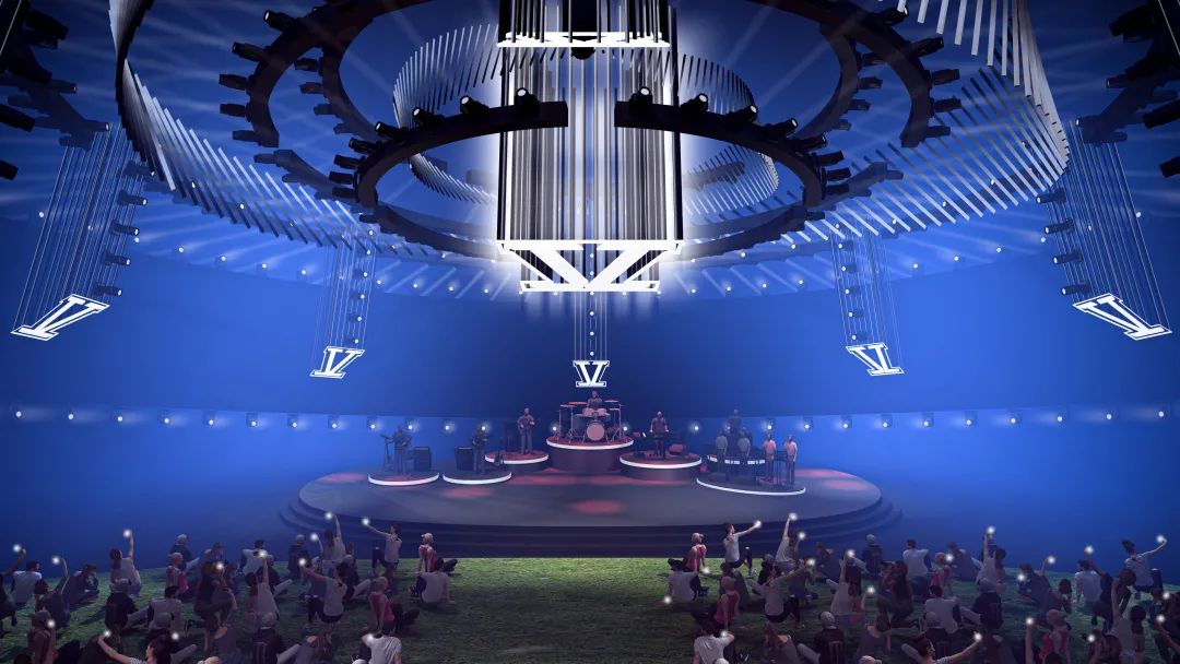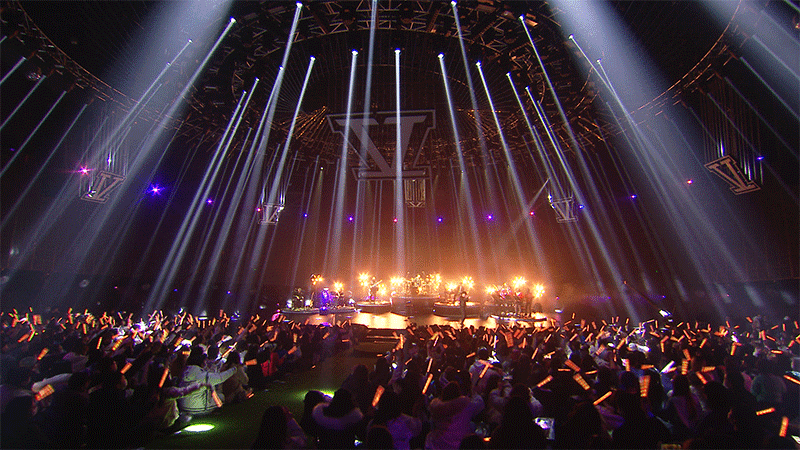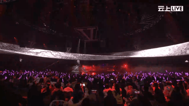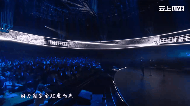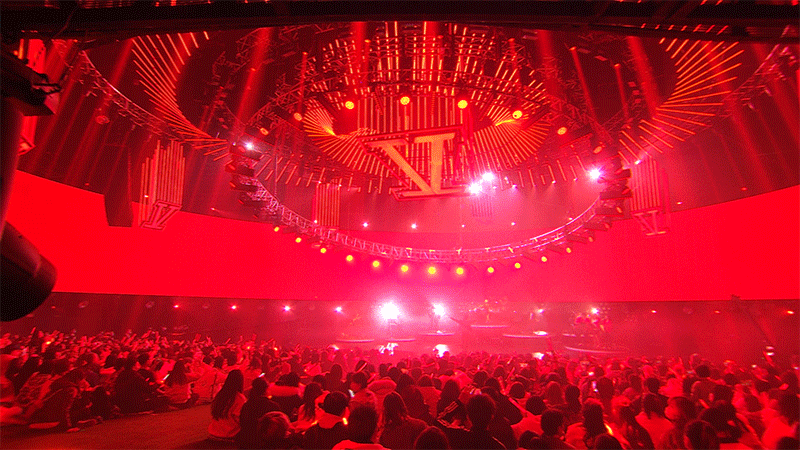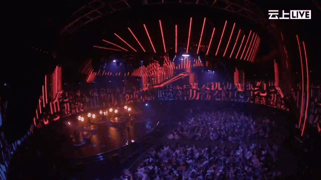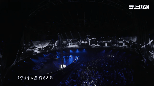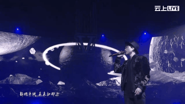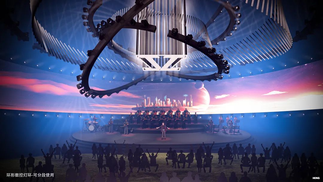 环形LED的设计把艺人,乐队,歌迷全部放在一个空间里,利用环形LED的数控进行变化,落下时实现艺人与歌迷真正的沉浸式舞美氛围;升起时是浩瀚的星空;倾斜时是行星划过的轨迹,多种变化创造独一无二的呈现。
