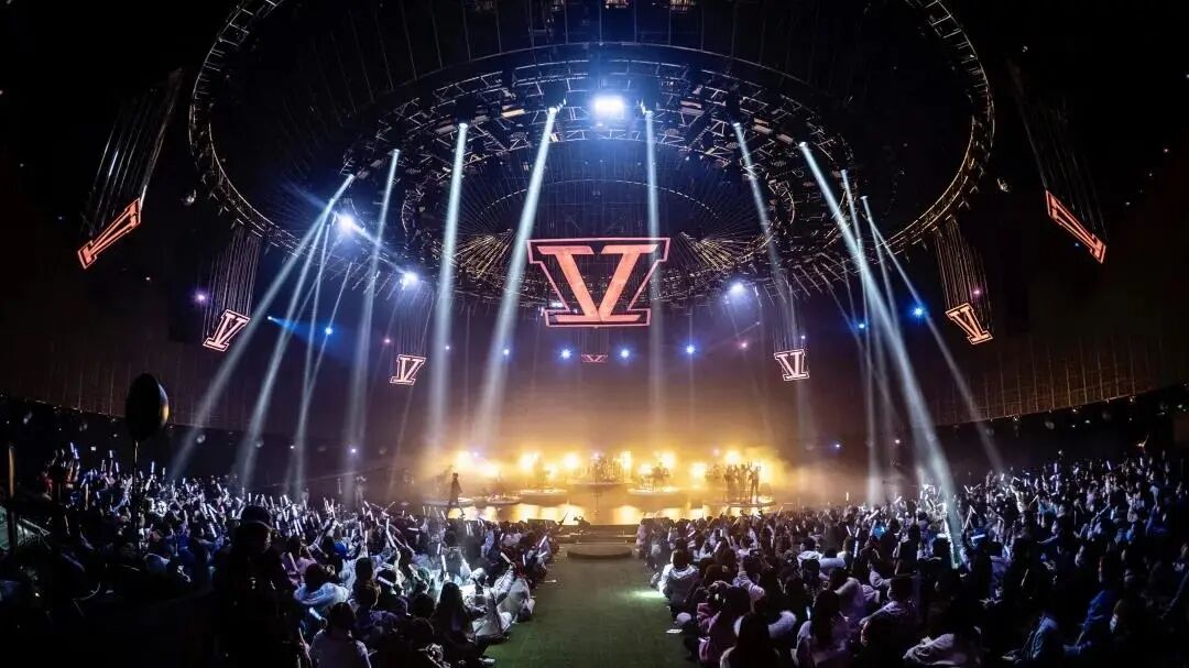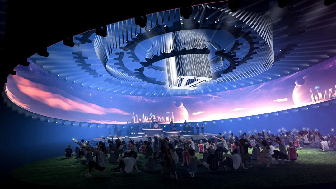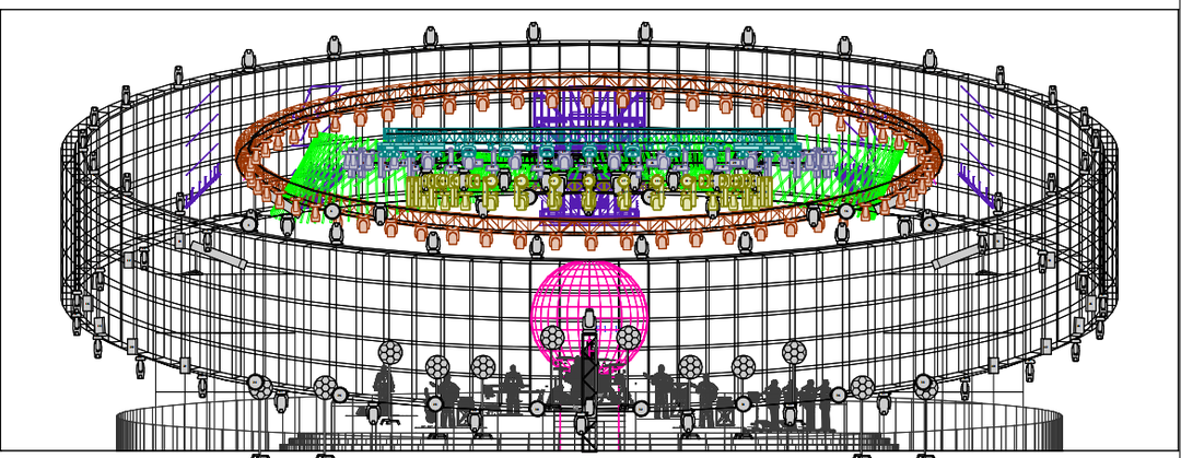 演唱会想要突出的概念是用机械穹顶和360度全维环绕的弧形屏幕,在演唱会现场打造了一个“宇宙虫洞”的舞台。那么这无疑就给音响系统的设计带来了一定的挑战,首先是360度的LED屏幕;其次是观众区和舞台区都是椭圆形状。在不影响到视觉上的效果呈现的前提下,音箱位置并不是非常理想。此外还要满足整个观众区的均匀度覆盖的同时确保舞台上监听环境的清晰度,更不能有过多的声音能量弥漫影响到舞台上的话筒拾音。