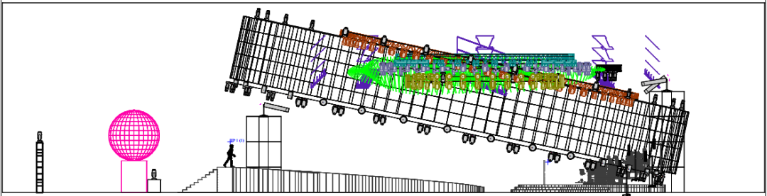 环形LED不仅是在视频内容制作上有难度,在设备搭建时要求也特别高。因为是内环形结构所以误差要控制在厘米级以内。难度高的部分就是35米大圆 ,受场地宽度和高度的影响,左右距离只有10cm,一环扣一环,35米圆总重18吨,需要22个1吨数控马达吊装,主要斜度的造型,这需要精准计算。如果哪个吊点有一点的受力不均,数控系统就会安全保护,导致35米圆动作无法完成。