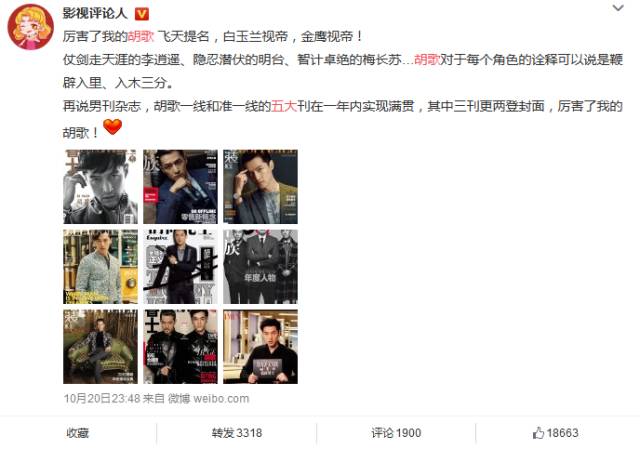 但即便是如此,老胡今年的成绩依旧不可小觑,除了接不完的代言,还有解锁了五刊封面,一年之内就实现了大满贯,这成绩还有谁!