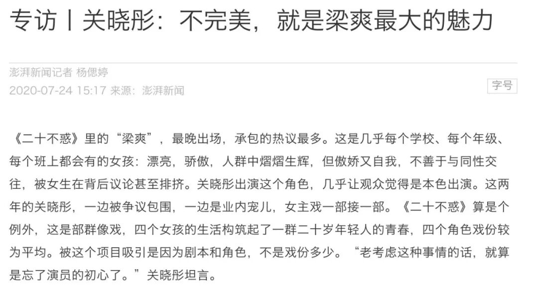 关晓彤为什么会接下这个“不讨喜”的角色? CHRISON作势 内地女星 2020-08-11 22:34:12 885 创作不易,用心坚持,欢迎请BaGua喝几杯爱心咖啡!打赏并支持本文 打赏并删除本文 《三十而已》之后,姊妹篇《二十不惑》也迎来了大结局。但这两部剧的情节走向和人物观念却截然不同:“姐姐”们已经察觉到青春流逝,却仍不甘接受生活中的不足与缺憾,于是不断寻求改变……而正值大好青春各位“妹妹”们,仍尚未理解为什么毕业前后会是“决定人生荒废与否”的重要节点。她们觉得与其把时间消磨在患得患失中,倒不如误打误撞闯人生。毕竟20岁的年轻人,最不缺的就是名为“时间”的试错成本。《二十不惑》刚开播时,姜小果讨债的桥段就上了热搜:为了追回三百块钱而据理力争,哪怕被对方站在道德高地上进行攻击,也绝不让步。屏幕前的观众也能代入去狠出一把恶气的姜小果,在出身设定上也是四个女主中最平凡的那一个。为了留在一线城市,成为想象中的白领女性,她在努力表达自己的所思所想。面试和实习时去借正装外套的举动,和喜欢背帆布购物袋上下班的通勤习惯,也像极了刚入职场的你我。甚至被领导为难,都会先担忧自己不能转正怎么办……但最终,她还是洒脱地喊出“搞丢一个工作没什么大不了的”再转身离开。没有过多人情负担和考量,处事逻辑完全依靠情绪本能,这样的设定“爽文”到有些不真实。但在初出社会的阶段,谁没有在努力压抑时想要不管不顾地这么自我几回呢?不管留长发短发、无论穿着开放保守,都可能遭遇恶意和揣测。但当下的年轻人们越来越明确这个观点:我为己悦而容,而不是为了去讨好谁。没有什么比“我”的感受更重要了。所以不管回归理性的大人们如何劝说,“追星女孩”仍愿意把时间、精力和金钱都“浪费”在所谓的“陌生人”身上。因为对于“追星少女”而言,这不过是在陌生偶像投射梦想和渴望,并以此丰富个人技能、扩大交际圈层的方式罢了……正是因为接触信息和拓宽交际的途径越来越多元,所以20岁左右的年轻人们不愿意禁锢自己去迎合这个世界。相比《三十而已》那种处处扎心的仓皇,作势君倒是觉得《二十不惑》里的众生相,都洒脱得千姿百态。恣意得令人甚至有些向往。剧里有个想要嫁给男明星的疯狂迷妹,负责泼冷水把她浇醒的长腿闺蜜是关晓彤出演的。所以很多人都用相关台词来做梗,把现实和剧中的吐槽迅速关联起来。但关晓彤这次的角色梁爽,是她,又不是她:依靠身材外形和高度自律来维持吸引力的她,很女明星。不怕撞衫的自信架势,也很“京城最beauty”。但童星出道便接戏的关晓彤,现实中未必需要依靠谁才能过活。很多观众在追剧过程中都忍不住问:“关晓彤为什么要接这部戏?”梁爽的戏份既算不上一番,也贪慕虚荣、还自恋的特质又显得不那么讨喜。但关晓彤说自己看中的,就是梁爽这个人物的“不完美”。她的确高冷又傲慢,习惯于享受富二代男友连哄带送当道歉的“忠犬表现”。但翻脸式索取和自虐式自律,其实只是因为够喜欢。所以在发现自己费劲维持的美貌,原来并不是能打开理想爱情钥匙的时候,也会突然崩溃和失控。从享受男友买买买,到艰难出击转做美妆博主,也是因为不肯服输。我们习惯用几个形容词去概括什么人设,但那只是出于某种介绍需求。人的魅力就在于复杂和多变,即便莎翁李白苏轼集体再世,也不敢托词能用不多的笔墨来定义谁的此时和永远。更不要说,对这帮自我到任性的Z时代人群了。你甚至无法跟上她们在想什么、下一秒又要做什么:因为在剧里演一个美妆博主,戏外的关晓彤也干脆录了好几条美妆vlog。当然作势君比较在意的是短片中她的造型变化。虽然关晓彤在微博再三抱怨自己新发型的失败,说自己“后悔了”,但还是将私服和妆容都做了相应尝试。有好几张照片,网友都感慨:风格不太像她了。但这不就是前文所提到的“年轻就是要尝试”吗?哪怕试错,也是收获。近期她最显眼的搭配单品,莫过于那只带点华丽的宝格丽七夕特别款Serpenti Cabochon手袋了。搭她的状态,也满足她试图尝试新风格的心情。紫色的闪光效果,来自薰衣草色金属水蛇皮,灵感来自凸圆形切割宝石表面的几何图案,还搭配了同色系渐变色的珐琅装饰包扣。对于80、90后们而言,薰衣草紫的确是浪漫爱情的文艺化意象,不过那是因为港台同名电影剧集,以及那部著名小说《普罗旺斯的一年》的综合影响。而到了千禧一代的2020年,当它再一次被赋予同样的表达意义时,与之相连的启发关联词这次是“宝格丽”。但这又不至于令人意外。来自罗马的宝格丽,从来承载着关于节日庆典的浪漫欢愉氛围,而和神话传说紧密相连的七夕情人节,也应该要在暗香浮动的悠然间,传递出久违的怦然心动。因为Serpenti Cabochon薰衣草色金属水蛇手袋的材质和色彩都相当特殊,因此宝格丽还特意为七夕推出了限定的套组礼盒。套组里的Serpenti Forever手环和手袋一样,同样采用了薰衣草紫水蛇皮材质,搭配渐变色珐琅和黑色缟玛瑙,爱心的元素成为了点缀。既知“二十不惑”的各位,宁可拥抱真实但不完美,也要拒绝面容精致的千品一律,向来设计突破大胆的宝格丽也心领神会。于是在这个需要用仪式感来证明爱意的七夕,它家的设计也用心来呈现不一样的华美:七夕特别款项链,是专属于这个夏天的浪