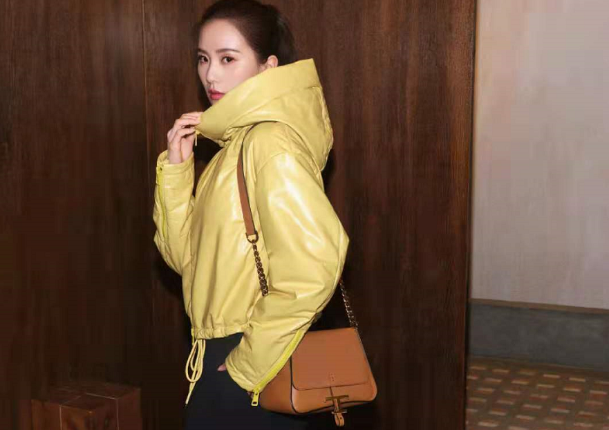 02亮黄色短款羽绒服+黑色高腰裤+棕色包包