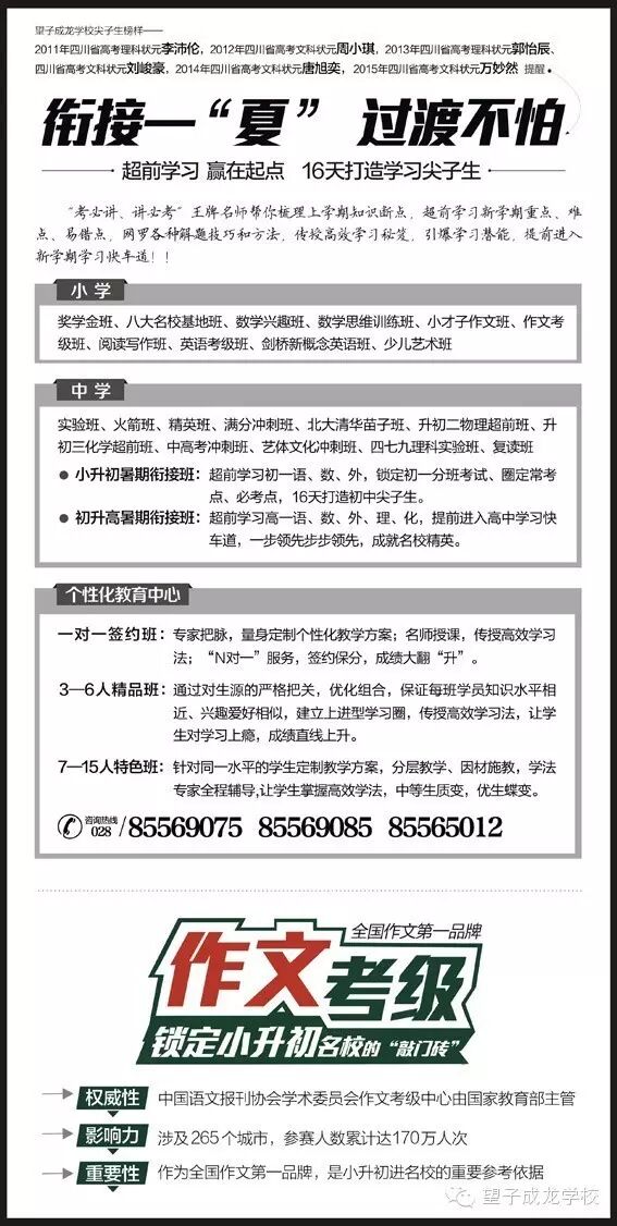 火红五月,浓情夏季,中国西部名校——成都望子成龙再掀助学风暴!即日起,凡转发此微信文章至朋友圈,凭截图即可成功抢到“望子成龙小学全城排位赛”参赛名额,我们将根据孩子各科考试成绩排名颁发高额奖学金。凡报名学生也将纳入我校“2017年小升初人才库”(请家长在我校官网或微信平台填写“2017小升初人才库”信息),届时我们将优先向全省各中学推荐入学。