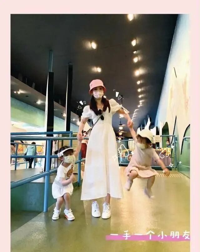 方媛带着孩子们出去玩,一只手牵着一个小朋友,孩子们这么可爱,她又这么洋气,回头率超高。