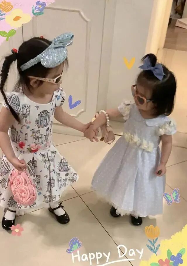 方媛本身很爱打扮,给孩子们的造型也很精致,小女儿才两岁,但也跟着姐姐学会了臭美,姐妹俩在家也打扮得漂漂亮亮,扎着蝴蝶结,带着小墨镜,挎着小包包,是精致公主没错了。