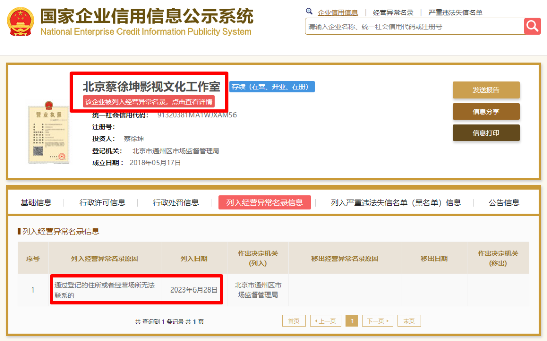 因为蔡徐坤工作室集体失联装聋作哑的行为,他的影视工作室被列经营异常。