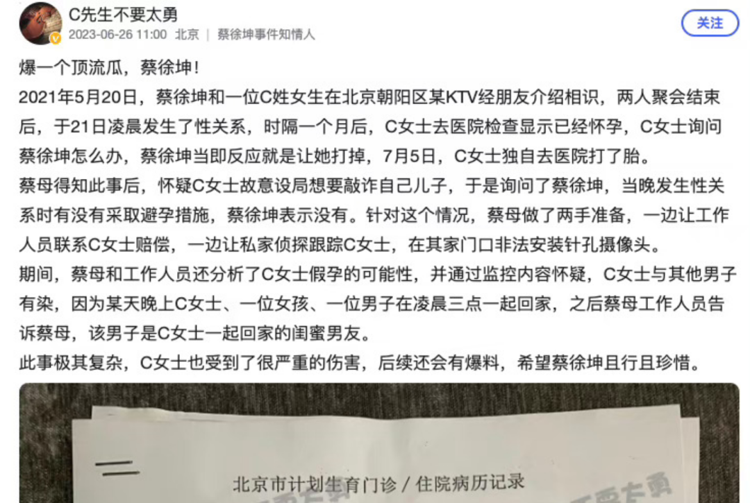 上周有知情人爆料,蔡徐坤在未采取避孕措施的情况下,让女性怀孕并打胎。