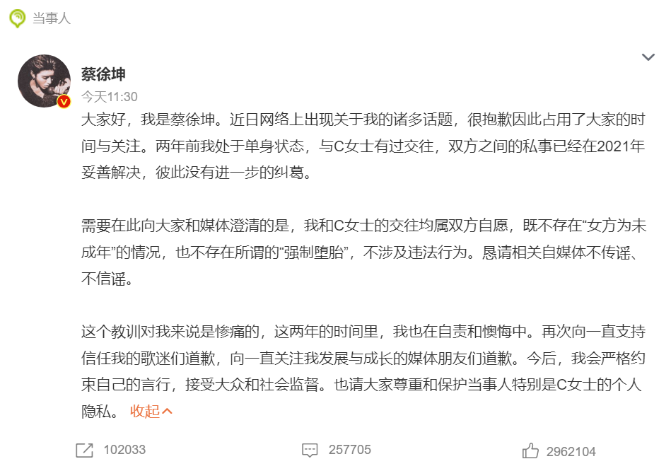 而上一份左脚踩右脚逻辑不自洽的回应,是蔡徐坤装聋作哑废寝忘食了7天时间的智慧结晶。