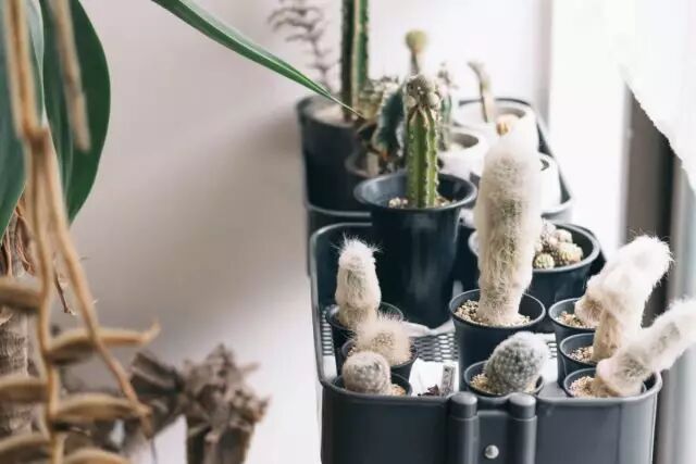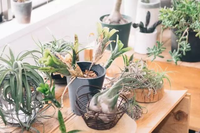 在迎着阳光的桌子上,摆放着各种各样的植物。