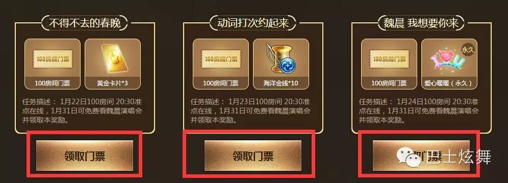 感谢新老玩家对梦工厂活动的支持,恭喜1月22,23,24日任意一天参加梦工厂100房间8:30准点在线活动的玩家,已获得1月31日免费观看魏晨演唱会的资格,请尽快来【魏舞活动】界面领取该资格。不要错过与魏晨的约会哦。