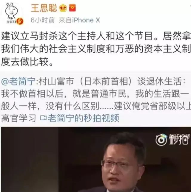 他在微博上是这样说的“建议立马封杀这个主持人和节目,居然拿我们伟大的社会主义制度和万恶的资本制度去做比较”