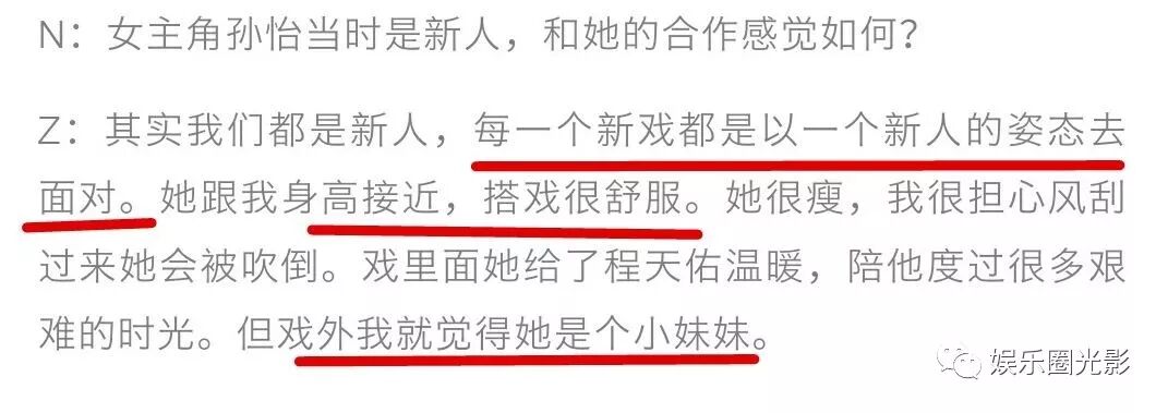 钟汉良被问到和还算新人的孙怡合作有何感觉时,钟汉良谦逊的说其实大家都是新人,每个新戏都是以新人的姿态去面对。戏里,姜生给了他扮演的程天佑很多温暖;戏外,钟汉良觉得孙怡是个小妹妹。他说孙怡身高很高,和她搭戏很舒服,也担心她太瘦会被风刮过来你吹倒。