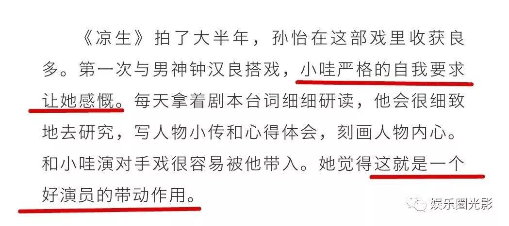 孙怡则表示钟汉良拍戏中的自我严格要求让她非常感慨,她表示钟汉良每天拿着剧本台词细细研读,很细致的去研究,写人物小传和心得体会,刻画人物内心。与钟汉良演对手戏,她能很容易被他带入,她认为这是一个好演员的带动作用。看来孙怡从实力派演员钟汉良身上获益良多。