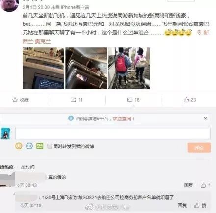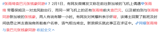 先是有网友微博发文称在前往新加坡的飞机上偶遇张雨绮带着保姆及一对龙凤胎出行,而同一架飞机上的还有张雨绮前夫袁巴元,以及被拍到与张雨绮同游新加坡的张钱豪,两人有说有聊一小时。