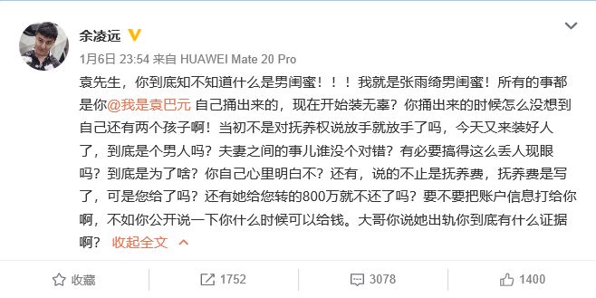 本来以为到了这里,故事应该告一段落了,结果袁巴元又开撕说张雨绮脚踩两条船还有狐臭。