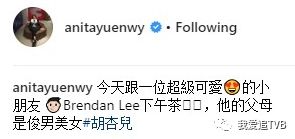 袁咏仪在Instagram上发放了一张,抱着Brendan仔的照片写到,“今天跟一位超级可爱的小朋友Brendan Lee下午茶,他的父母都是俊男美女”。