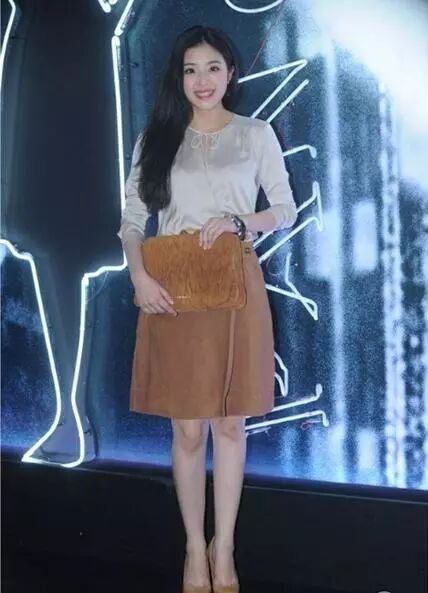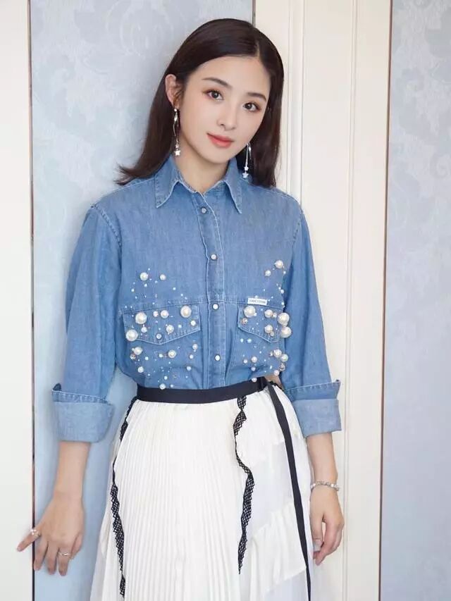 张含韵身穿牛仔上衣,珍珠的点缀使牛仔上衣不再单调,搭配白色的百褶裙,看起非常的清新舒适。