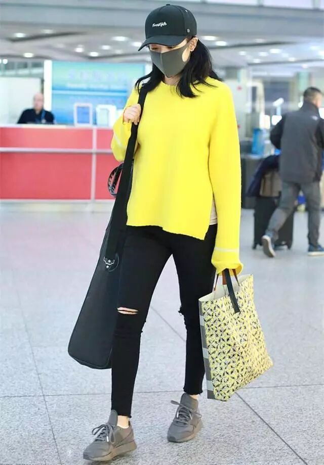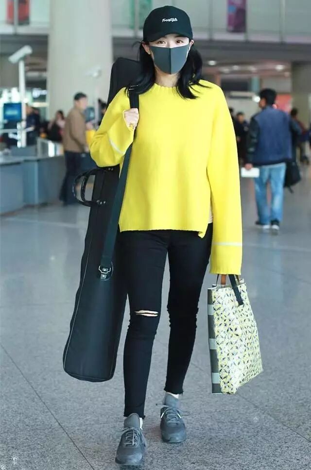 近日,张含韵现身某机场,头戴黑色棒球帽,身穿黄毛衣搭配破洞裤,再次美出新高度,这身黄色上衣看起来非常的衬肤色。