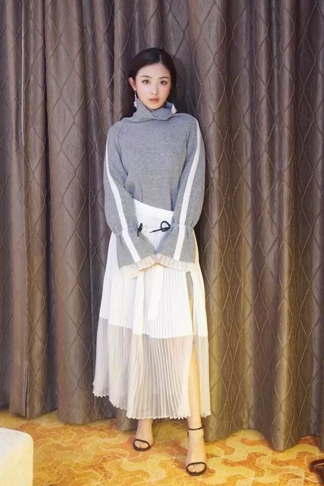 灰色高领连衣裙,裙子是白色百褶布料的设计,搭配一双黑色一字带高跟鞋,简单又不失时尚感。