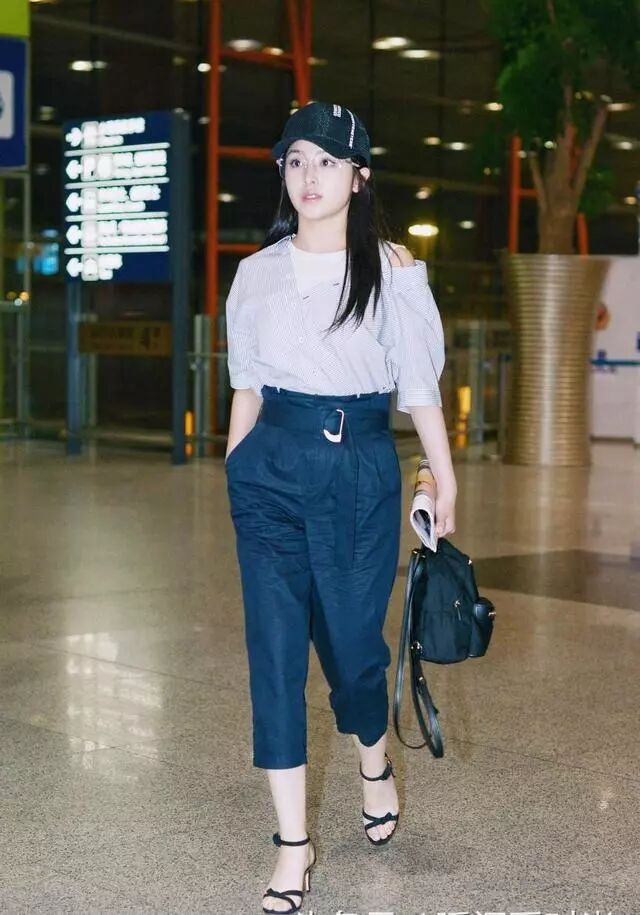 头戴棒球帽,身穿露肩短袖衬衣,搭配九分裤,脚踩一双高跟凉鞋,简单又清新,这样的穿搭非常适合她。