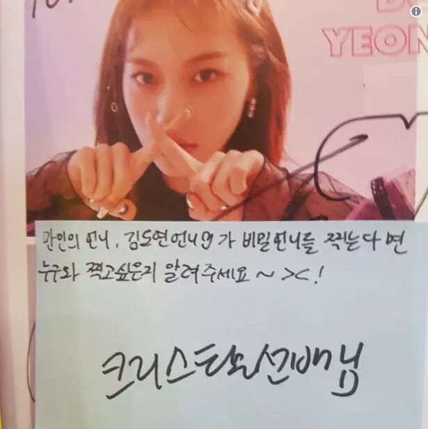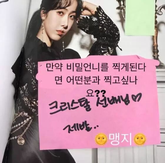 接着是GFRIEND的信飞,同样也选择了Krystal,甚至在粉丝给的便条纸上面写下:「Krystal前辈,拜托..」看来是很恳切地希望能跟Krystal一起出演阿。