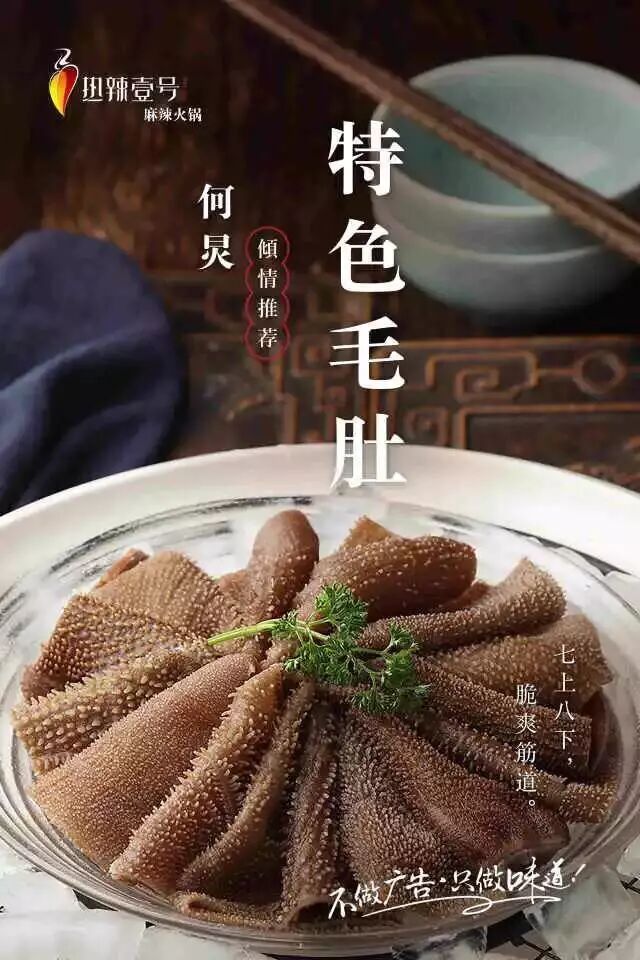 四川空运而来的没有经过碱发的新鲜毛肚,下锅15秒即可食用,脆脆的有嚼劲。