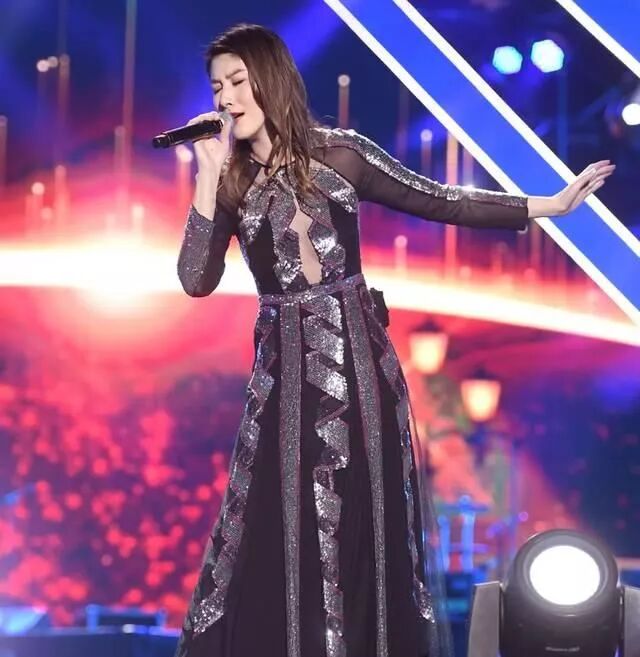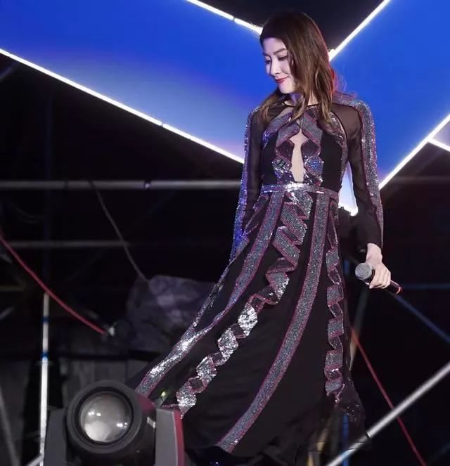 舞台上的陈慧琳美极了!她微卷的长发轻垂,非常自然秀美,五官精致的脸上化着浓艳的妆容,十分出挑。她穿着一袭黑色连衣裙,沉稳大气,上衣部分小露性感,裙子修身的版型更好衬出她纤瘦高挑的身姿,别致的条纹带很有个性。