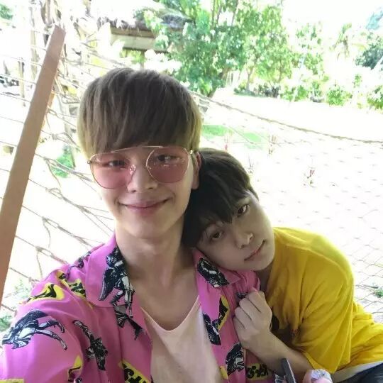 照片中装载着粉色时尚的陆星材和穿着与小鸡练习生相符的黄色T恤的柳善皓。陆星材暖暖的外貌,消化了独特框架的粉色太阳眼镜。柳善皓靠着既是前辈又是哥哥的陆星材的肩膀,展示了充满撒娇的样子,吸引了人们的视线。