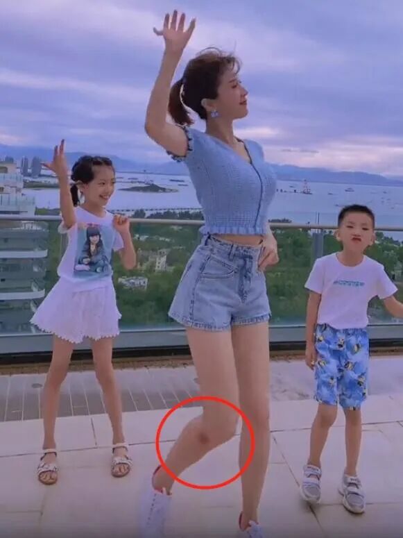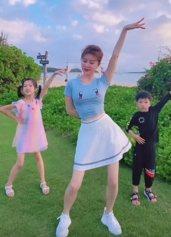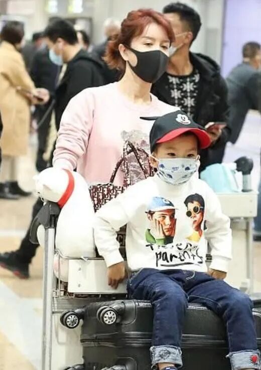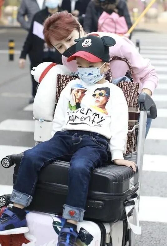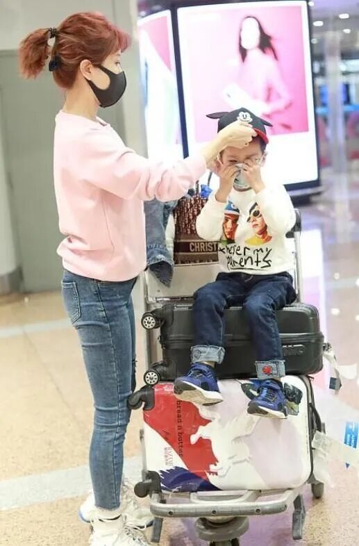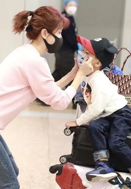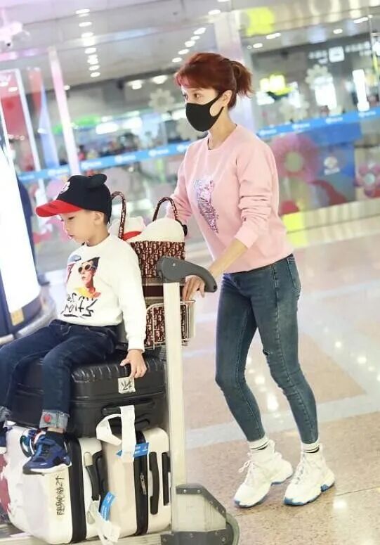 金巧巧带儿子去机场拍照。她身穿粉色T恤和紧身牛仔裤,效果意外