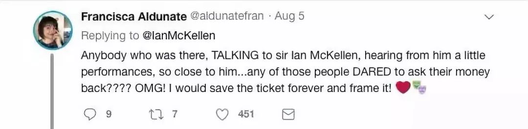 “坐在那的人能听到伊恩·麦克莱恩说话,离他如此之近听到他演绎一些片段,还怎么敢要回票钱???我会永远珍藏这张票并且以它为荣。”