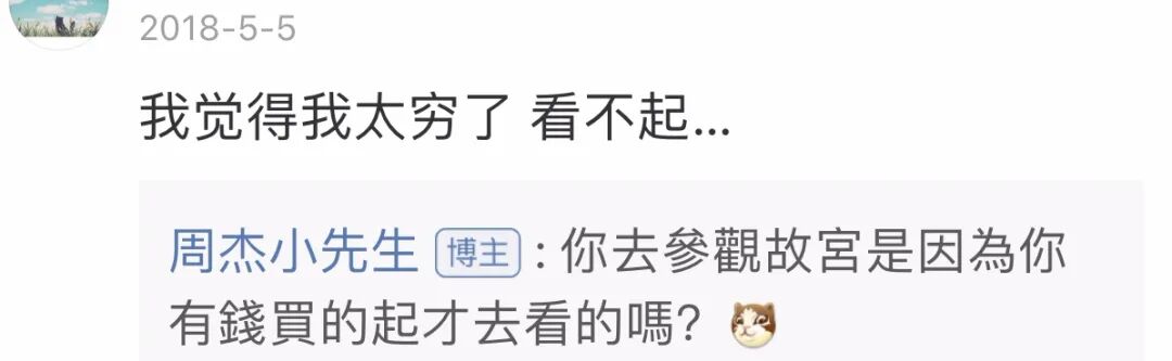 有网友在他这贴微博下留言:我觉得我太穷了,看不起。周杰直接回怼:你去参观故宫是因为你有钱买得起才去看的吗?▼