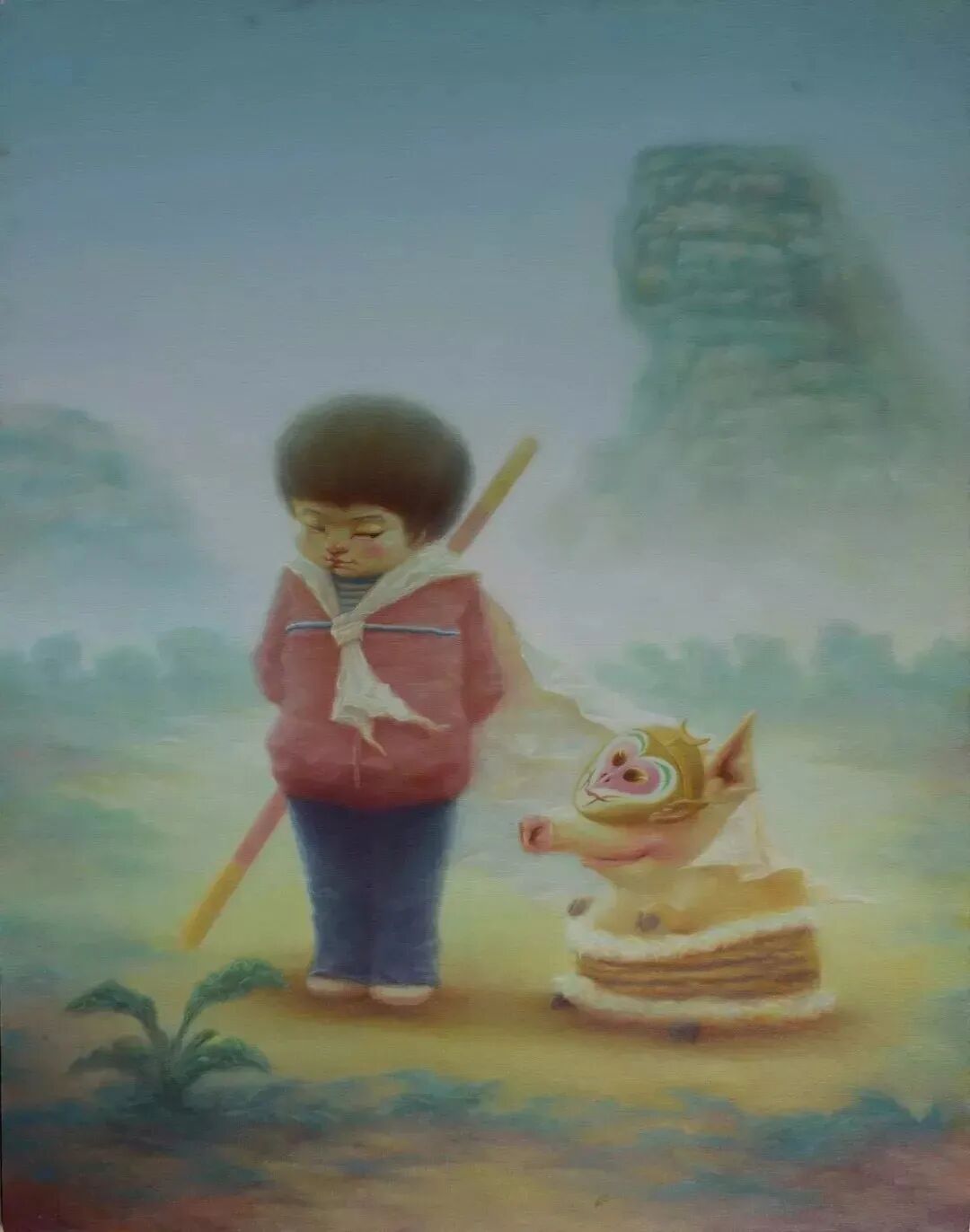 ▲虽然收藏的第一幅画是国画,但其实周杰最喜欢的是油画,图为他收藏艺术家张发志的《理想漂浮的红领巾》,2005年 布面油画