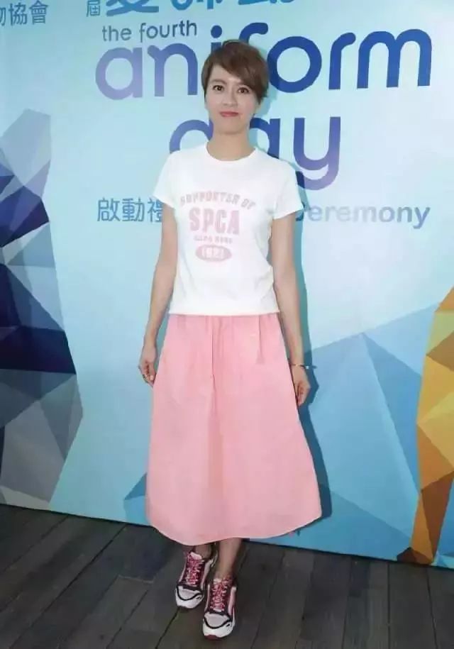 梁咏琪为了减龄也是很拼了呀,白色的t恤搭配粉色的裙子,连球鞋都要戴着粉色,可是穿上去却让人觉得哪里怪怪的,虽然说他还挺有年轻感的,但是这一袭裙子和她的气质明显不搭了,看上去就让人觉得奇怪。