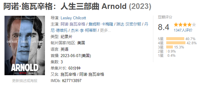 《阿诺·施瓦辛格:人生三部曲》是Lesley Chilcott执导,阿诺·施瓦辛格主演的纪录片,该片共三集,于2023年6月7日上线Netflix。讲述阿诺德·施瓦辛格的生活,从他练健美的日子到他在好莱坞取得成功,他担任加利福尼亚州州长期间的故事,以及他家庭生活的欢乐和动荡。施瓦辛格、他的朋友、他的竞争对手前所未有地接受了最坦诚的采访。